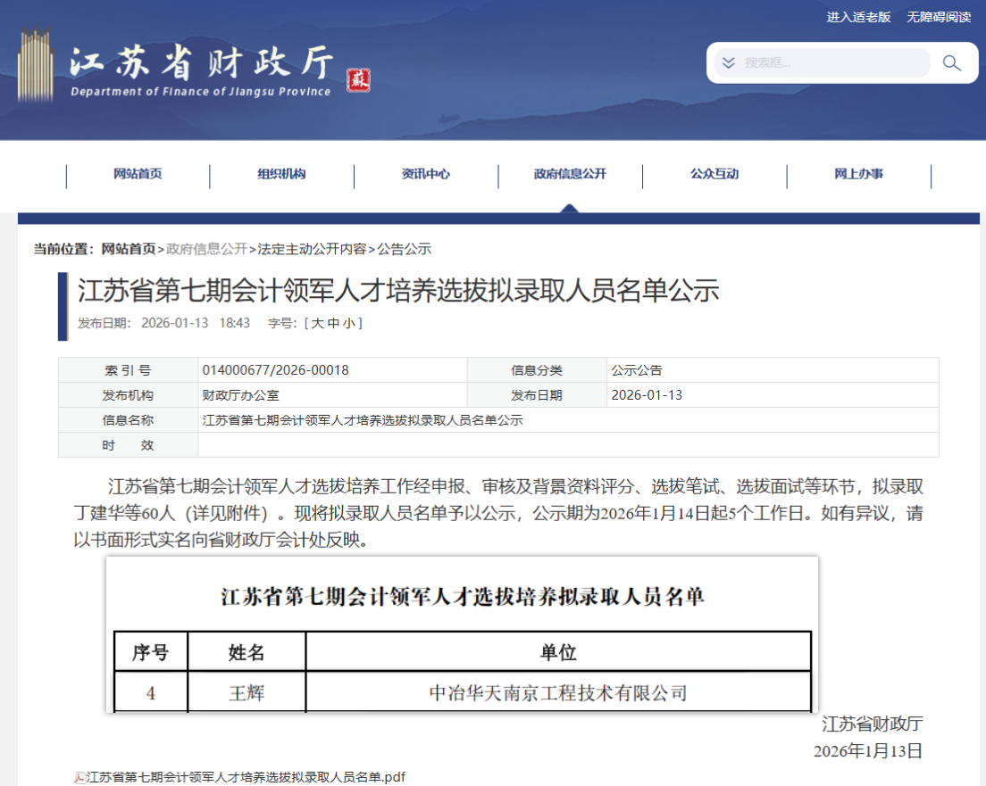 1月13日,江蘇省財政廳公布“江蘇省會計領(lǐng)軍人才”(第七期)擬錄取人員名單。經(jīng)過申報、資格審核、背景評分、筆試與面試等多輪嚴(yán)格選拔,中冶華天財務(wù)管理部王輝從全省央國企、上市公司、三甲醫(yī)院、高等院校、獨角獸企業(yè)等各類重點單位的優(yōu)秀財務(wù)負(fù)責(zé)人及總會計師群體中脫穎而出,成功入選,再次彰顯了華天財務(wù)人員的專業(yè)實力與業(yè)務(wù)素養(yǎng)。