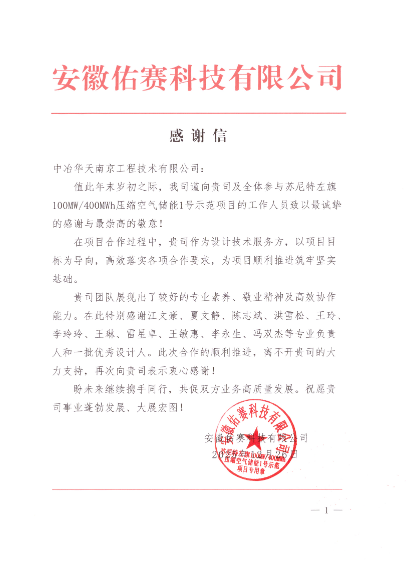 近日,中冶華天收到來自蘇尼特左旗100MW/400MWh壓縮空氣儲能1#示范項(xiàng)目合作方安徽佑賽科技有限公司(簡稱“佑賽科技”)的感謝信,信中對中冶華天在項(xiàng)目合作過程中展現(xiàn)出的專業(yè)能力和敬業(yè)精神給予高度評價,對設(shè)計團(tuán)隊(duì)成員表示衷心感謝,集中展現(xiàn)了公司踐行的高品質(zhì)履約精神與華天人的向陽風(fēng)貌。